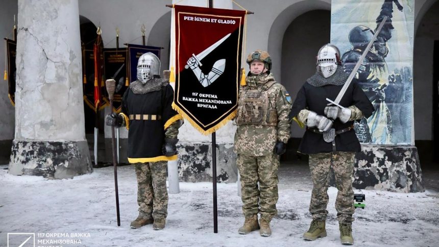 У 117 важкій механізованій бригаді відбулася офіційна церемонія вручення командиром військових корогв батальйонам та дивізіонам Гарно. Орденістично. Deus Vult